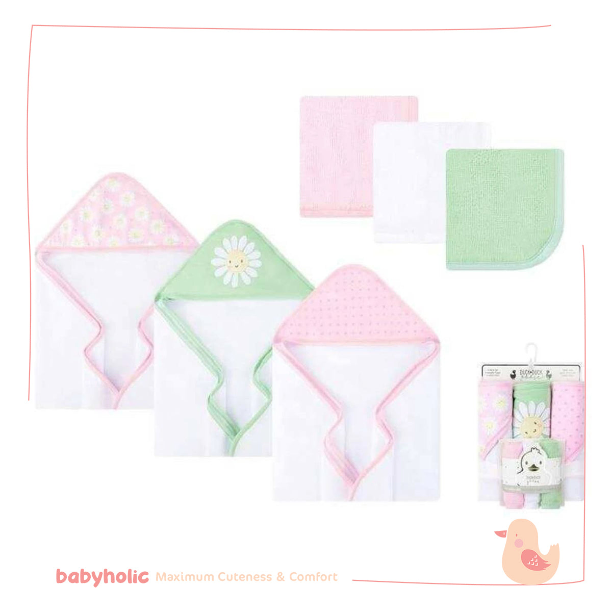 - Size: - Hooded Bath Towel 71cm x 71cm; - Washcloths: 22cm × 22cm